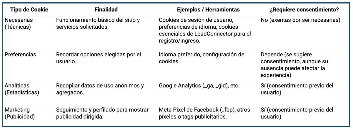 Cookies de funcionalidad de la plataforma (LeadConnector): Nuestra plataforma de registro y el centro de contenidos digitales —proporcionados técnicamente a través de la tecnología LeadConnector— utilizan cookies propias para garantizar su funcionamiento. Estas cookies permiten, por ejemplo, recordar los datos introducidos por el usuario a lo largo de un flujo de registro (de modo que no tenga que reingresarlos al cambiar de página), hacer seguimiento interno del avance del usuario en un embudo de conversión (funnel) para fines analíticos internos, o mantener la persistencia de la sesión del usuario una vez autenticado. Algunas de estas cookies son estrictamente técnicas y necesarias para prestar el servicio solicitado (por lo que se instalan sin requerir consentimiento), mientras que otras pueden tener carácter analítico o de seguimiento interno. En cualquier caso, Gemas Financieras trata estos datos conforme a esta Política y, cuando corresponde, su uso queda supeditado al consentimiento del usuario.